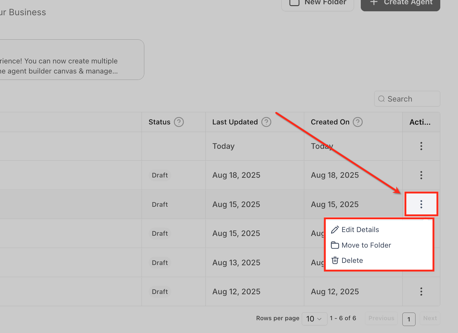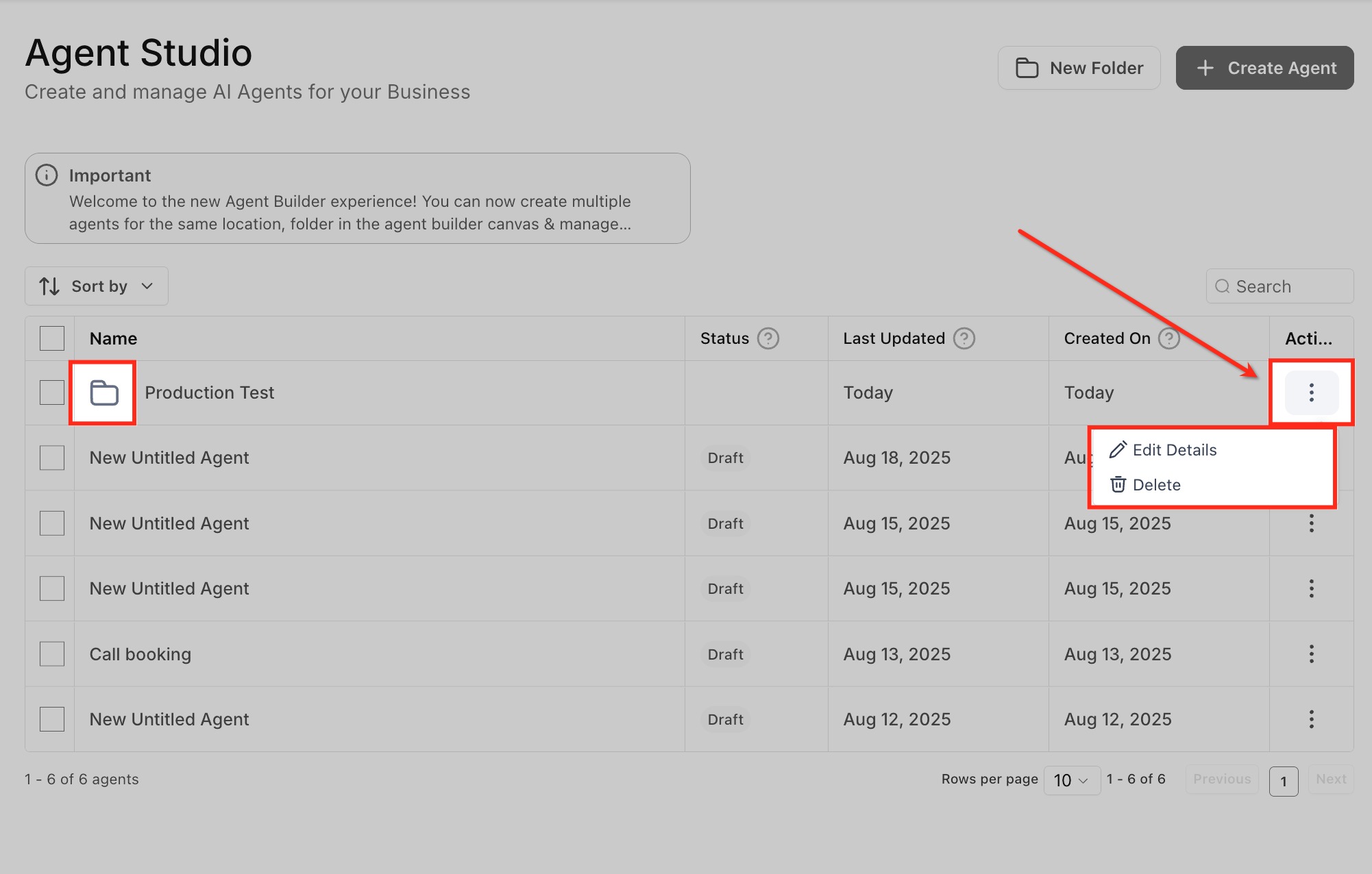 Click the three-dot (⋮) menu on any agent row to access individual actions. From here, you can edit details, move the agent to a folder, or delete it.
