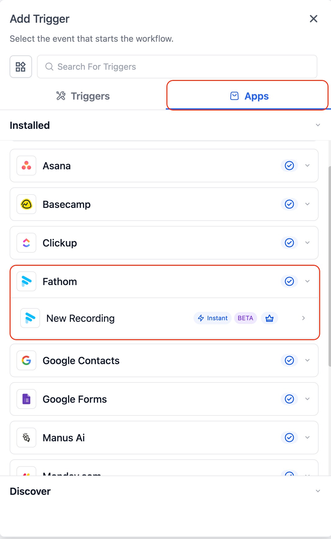 The Fathom integration allows you to automatically access meeting recordings, transcripts, and summaries inside workflows.