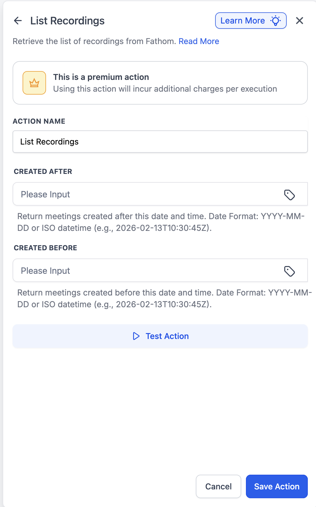 Yes. Fathom actions (such as fetching transcripts, summaries, or recordings) are considered premium workflow actions and will be charged at default rate per execution.