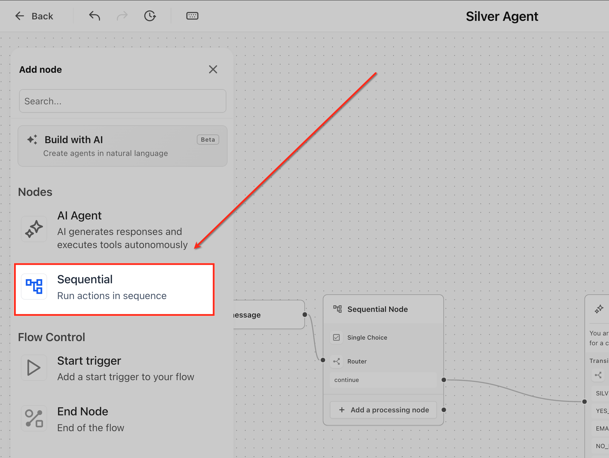 Use Sequential Node when you need a structured, predictable flow. Use AI Agent Node when the interaction requires dynamic decision-making or conversation.