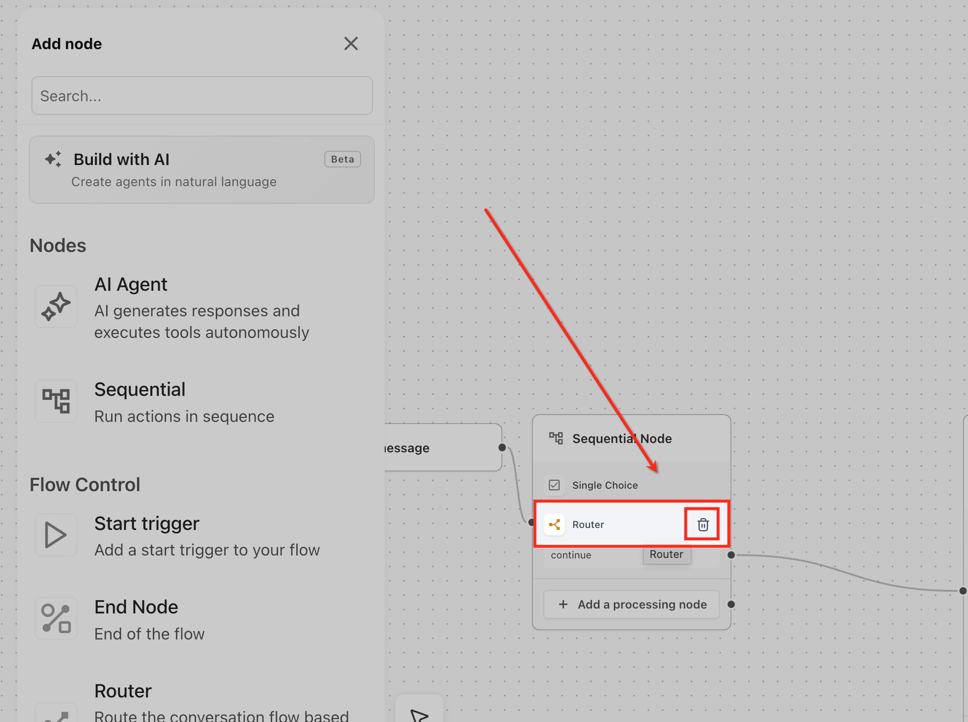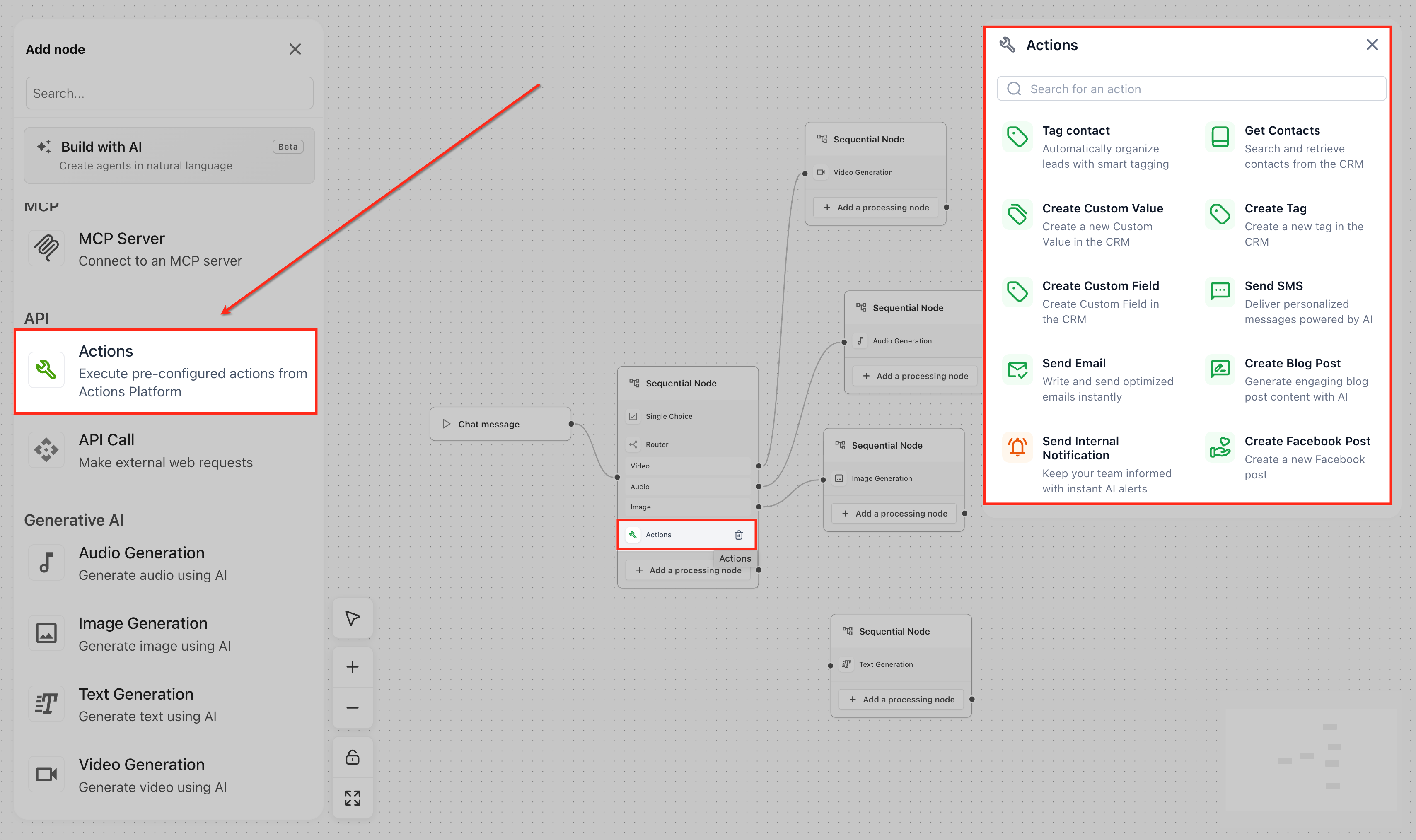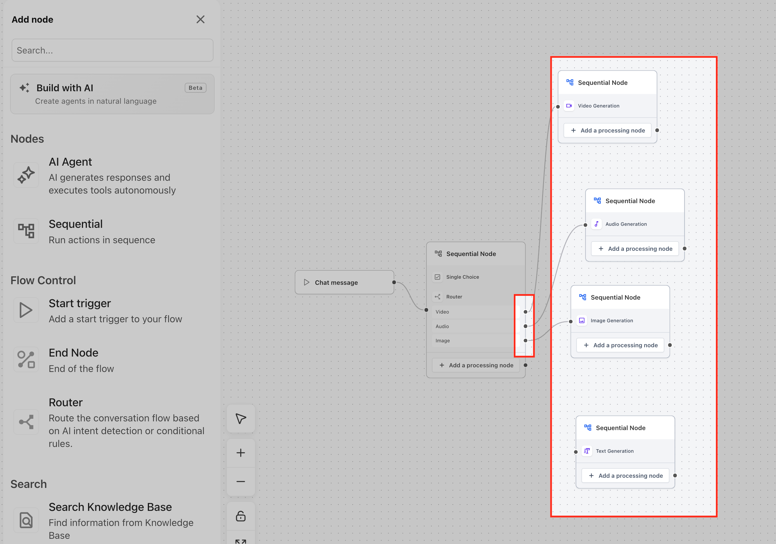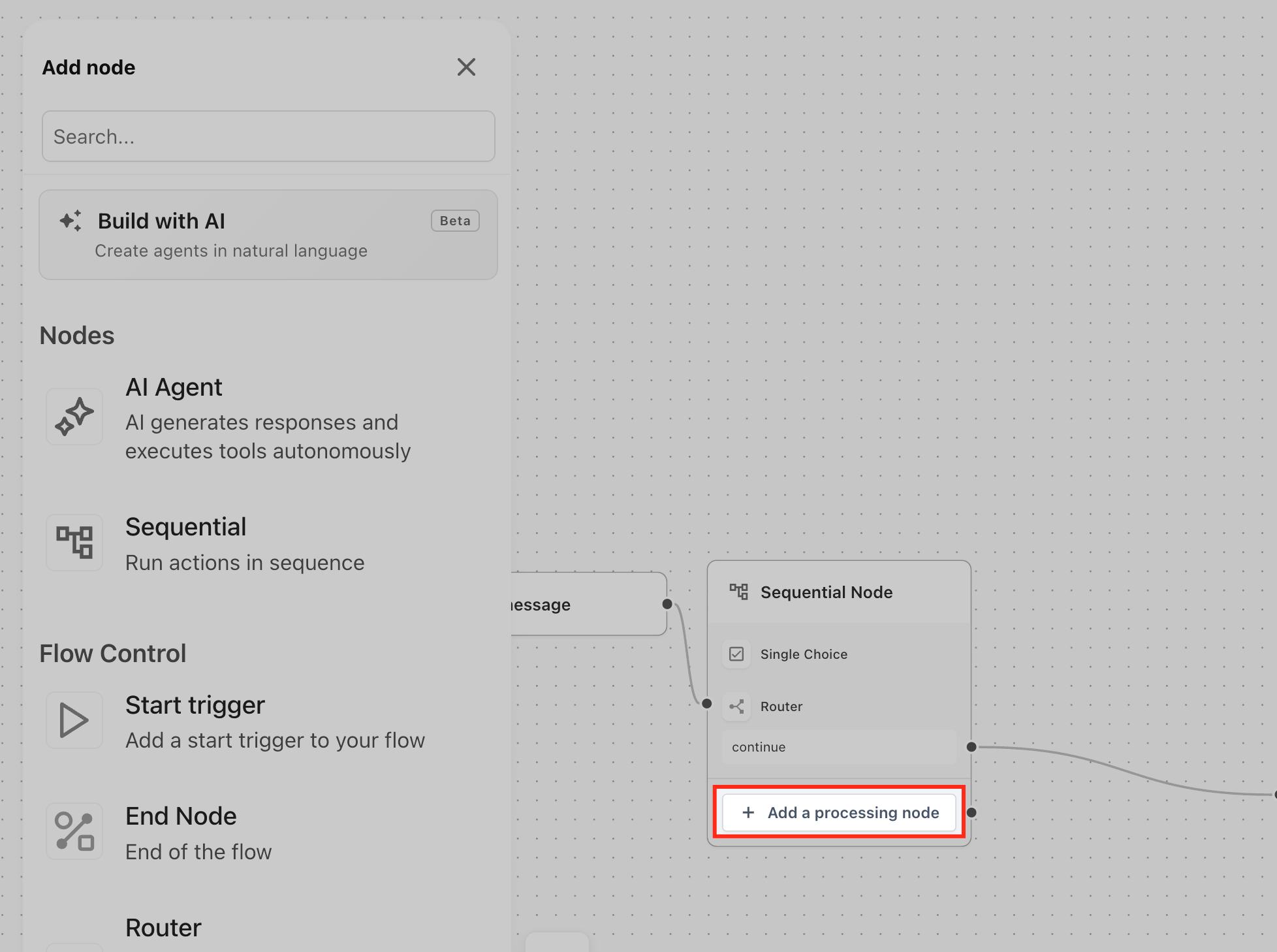 Each step inside a Sequential Node is created using a processing node. These processing nodes define the individual actions that will be executed in sequence, such as capturing input, making an API call, or generating content.