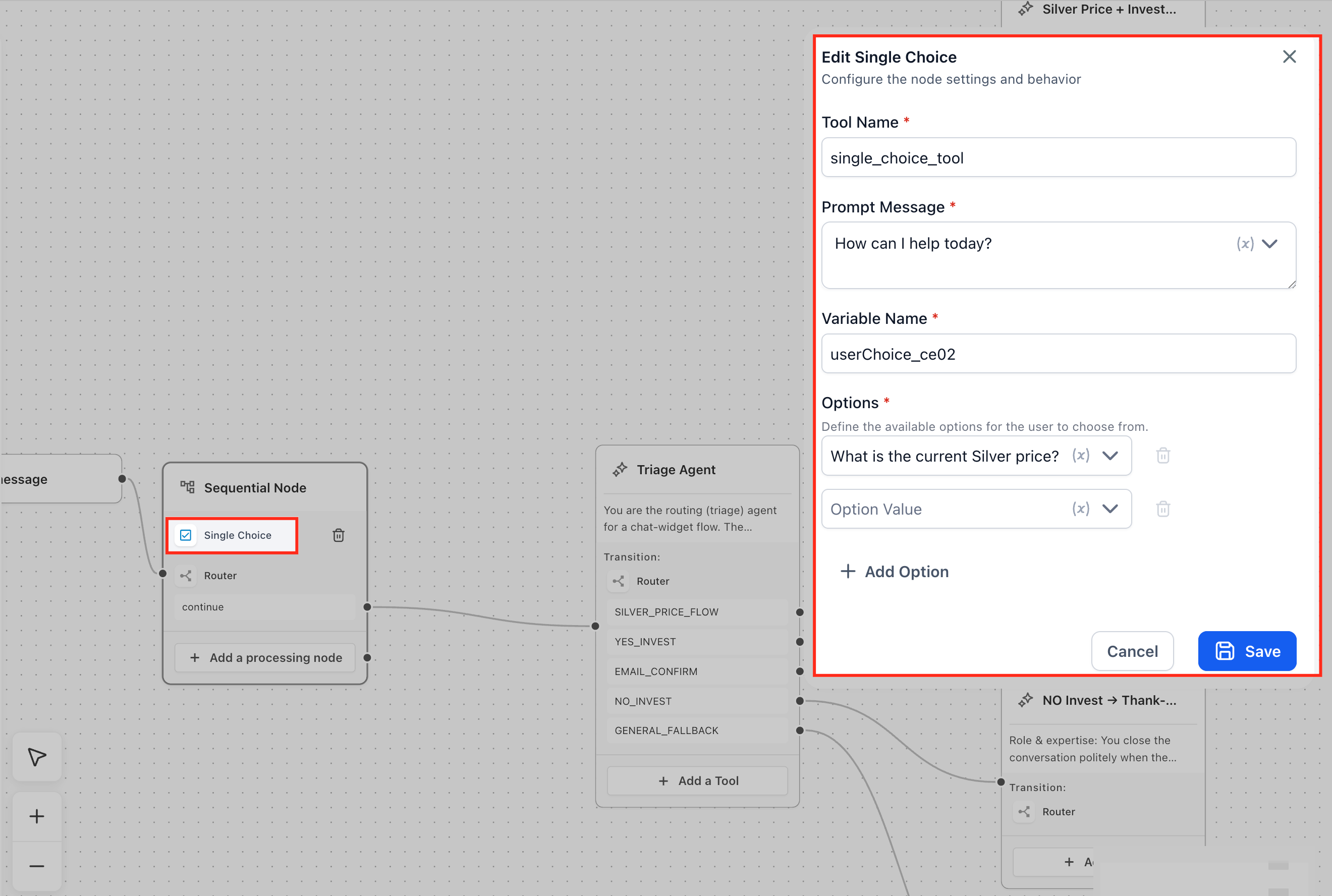 Use this node when you want users to choose from specific options such as service types or preferences. Configure the choices and prompt message, as the selected option is stored as a runtime variable for routing or processing.
