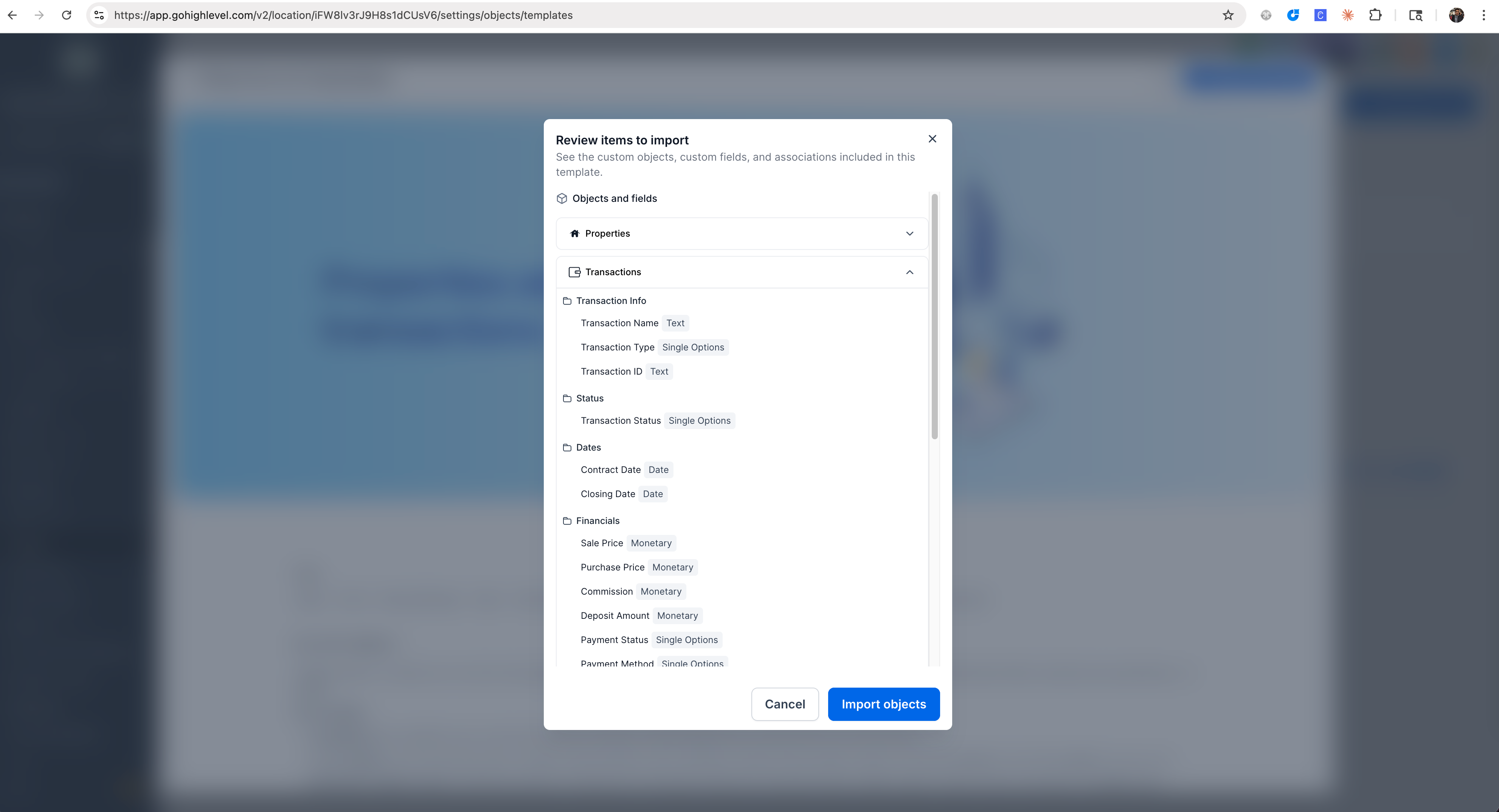 4.Click Import objects to apply the template to your account.