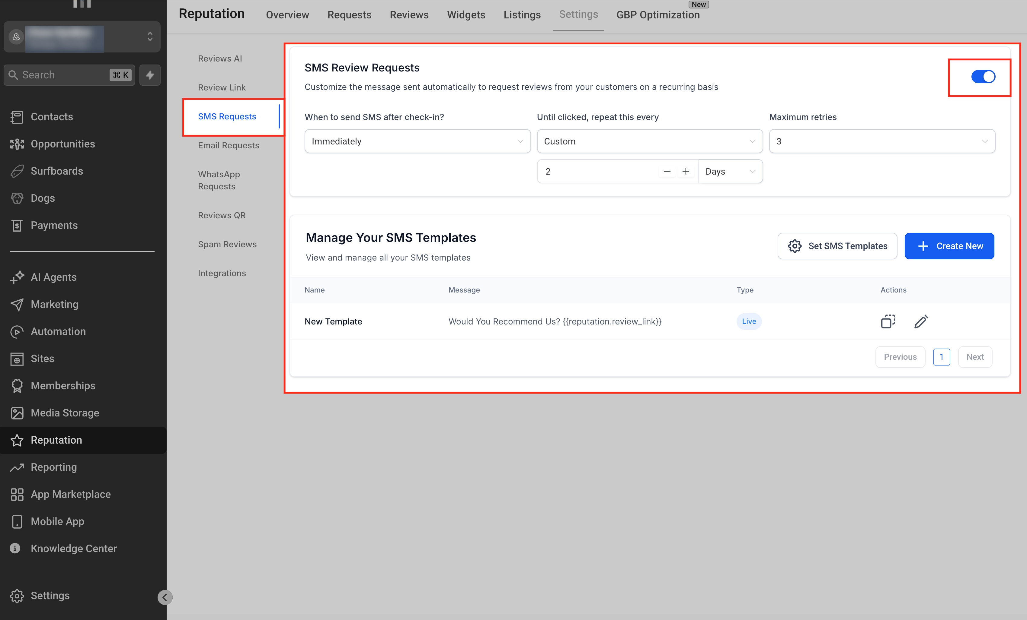 Open Reputation → Settings → SMS Requests and toggle the switch in the top-right to activate automated review texts. Set When to send after check-in, choose the repeat interval and Maximum retries, then use Create New or Set SMS Templates to manage the messages shown below.