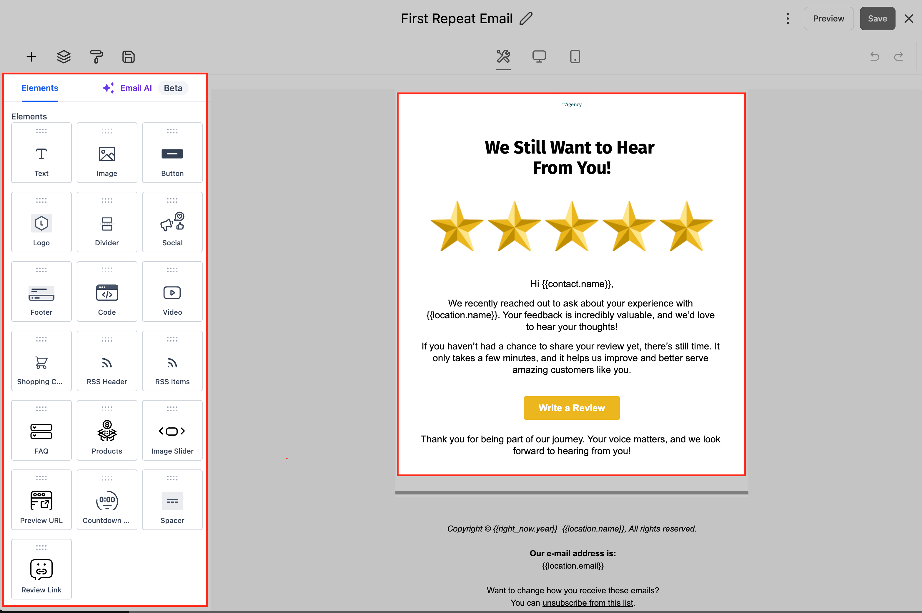 Use the drag-and-drop email builder to add text, images, and buttons from the Elements panel on the left. Drag the Review Link element (bottom-left) into your layout so the CTA opens your configured review URL, then click Save in the top-right.