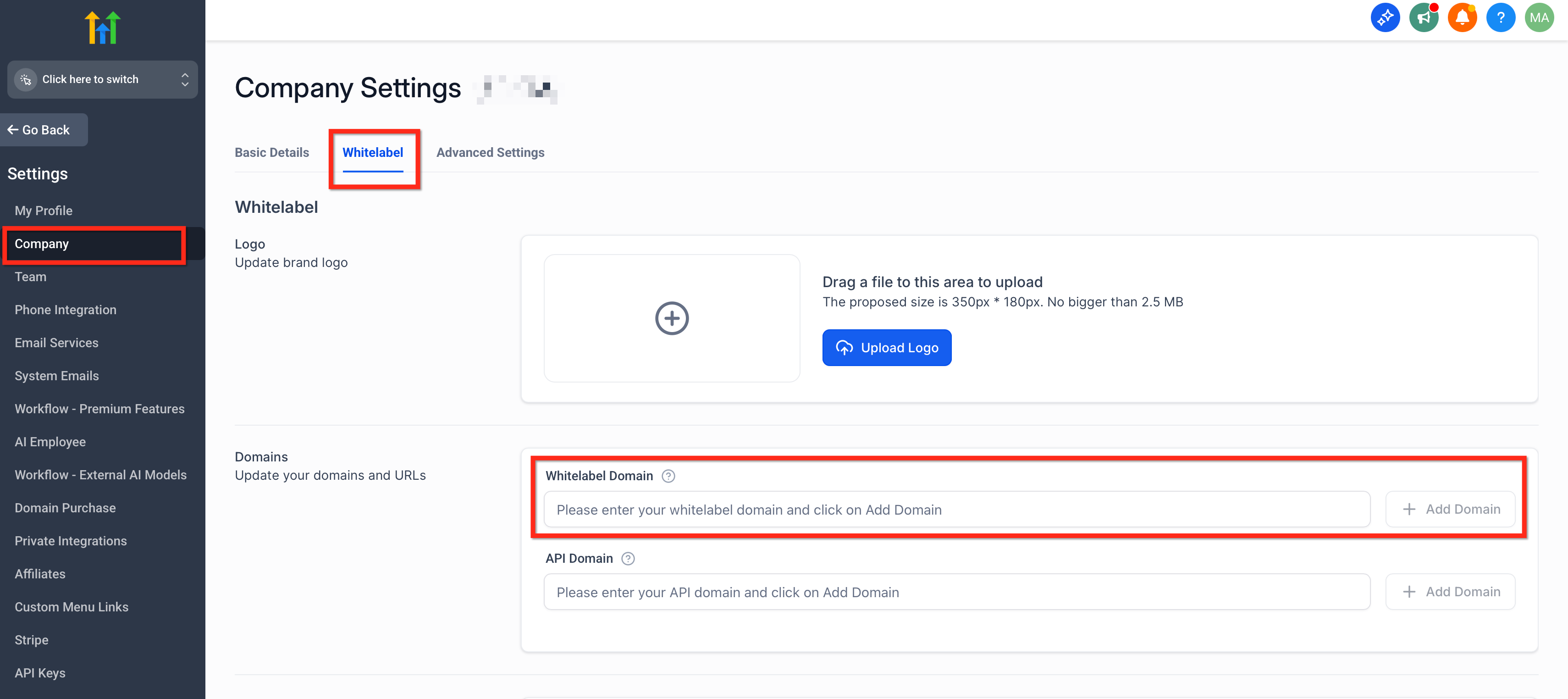 Go to Agency View → Settings → Company → Whitelabel → Whitelabel Domain.