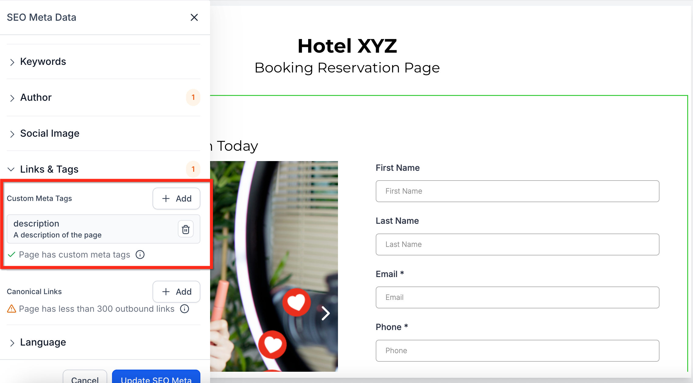 You can add custom meta tags to funnel and website pages by clicking SEO Meta Data icon at the top of the builder.