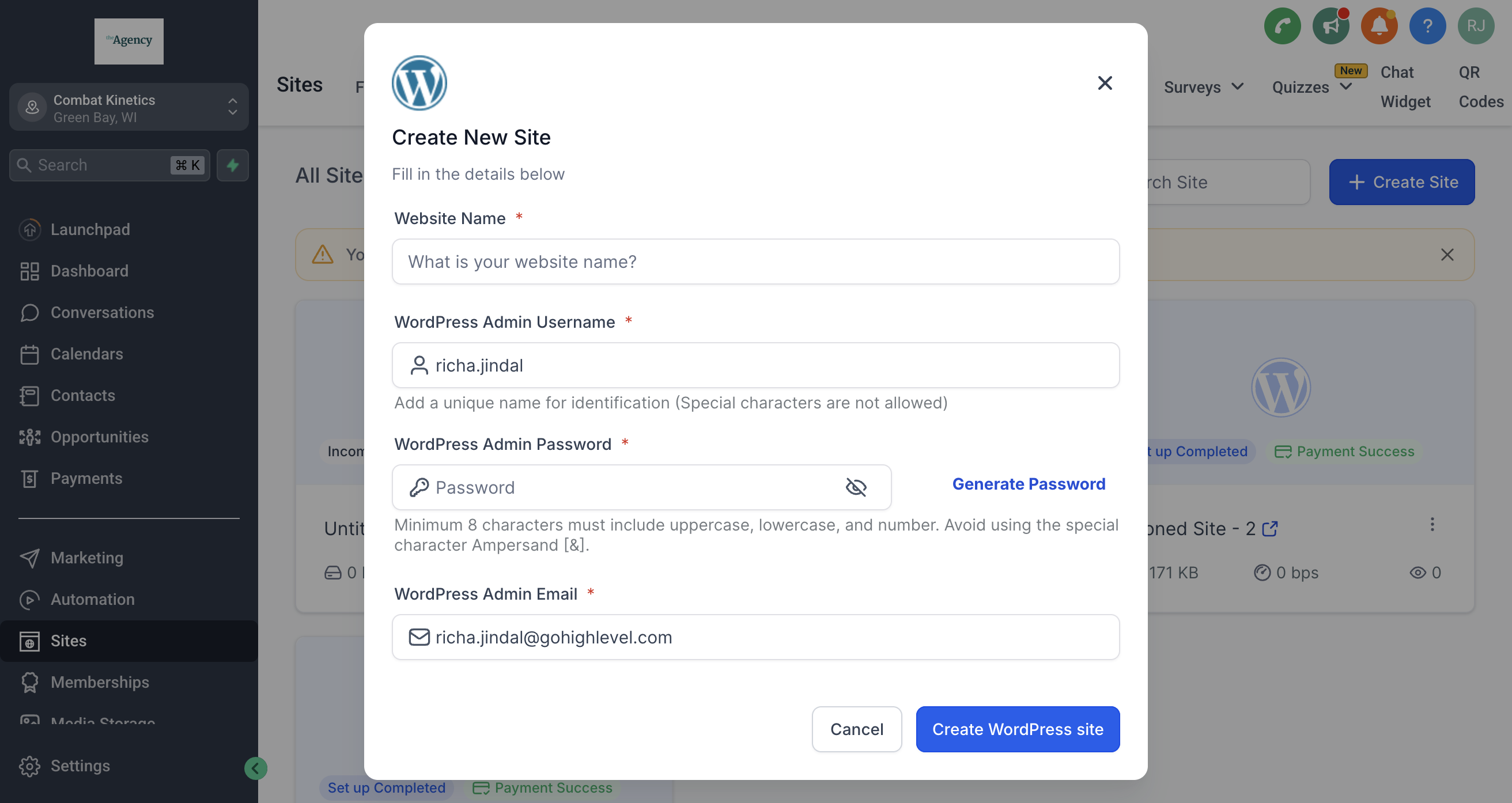 1. To set up your WordPress site, you need to have purchased the WordPress hosting feature under the Sites tab. Once this has been done, you can get started by clicking the "+ Create Site" button