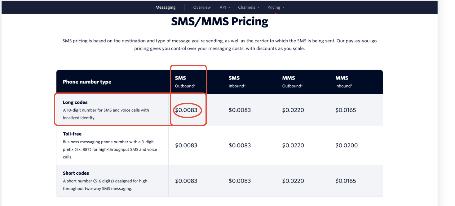 - Then scroll down to "SMS/MMS Pricing." Locate your "Per-Segment Costs". In our example, we are sending an outbound SMS for long codes. So we choose $0.0083 for this example.