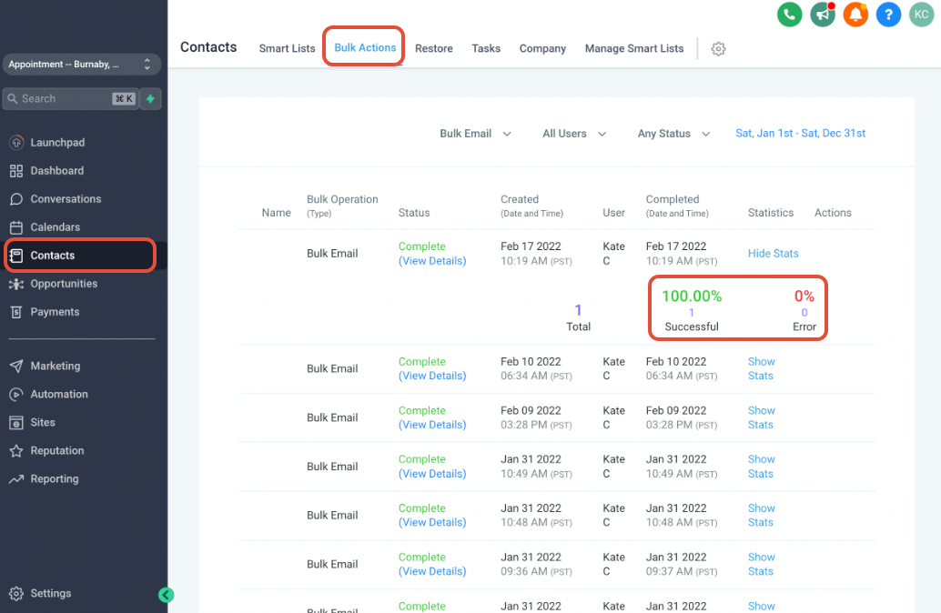 View the performance of one-time bulk email sends directly from the Contacts > Bulk Actions tab. This is ideal for reviewing large sends outside of automations or campaigns. This view also allows you to see performance by individual recipient, making it easier to troubleshoot delivery issues or segment follow-up actions. To access stats: