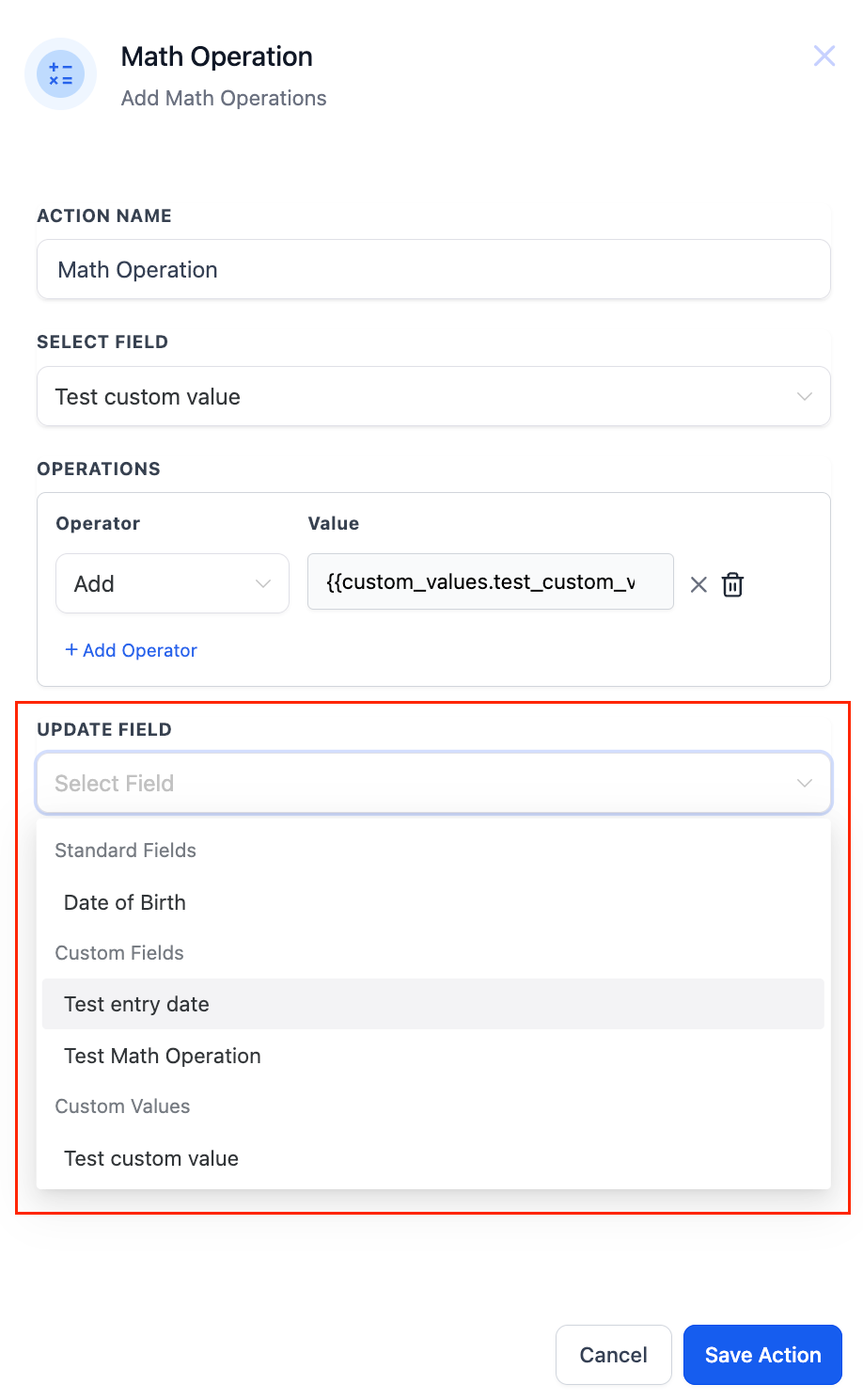 - Choose the field to update: Select the numeric or date field you want to update with the result of the math operation. Depending on your requirements, this field can be a standard or custom field.