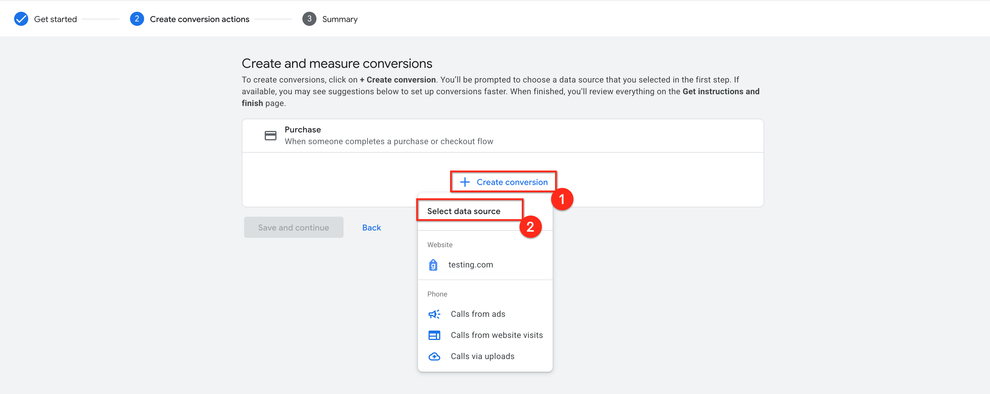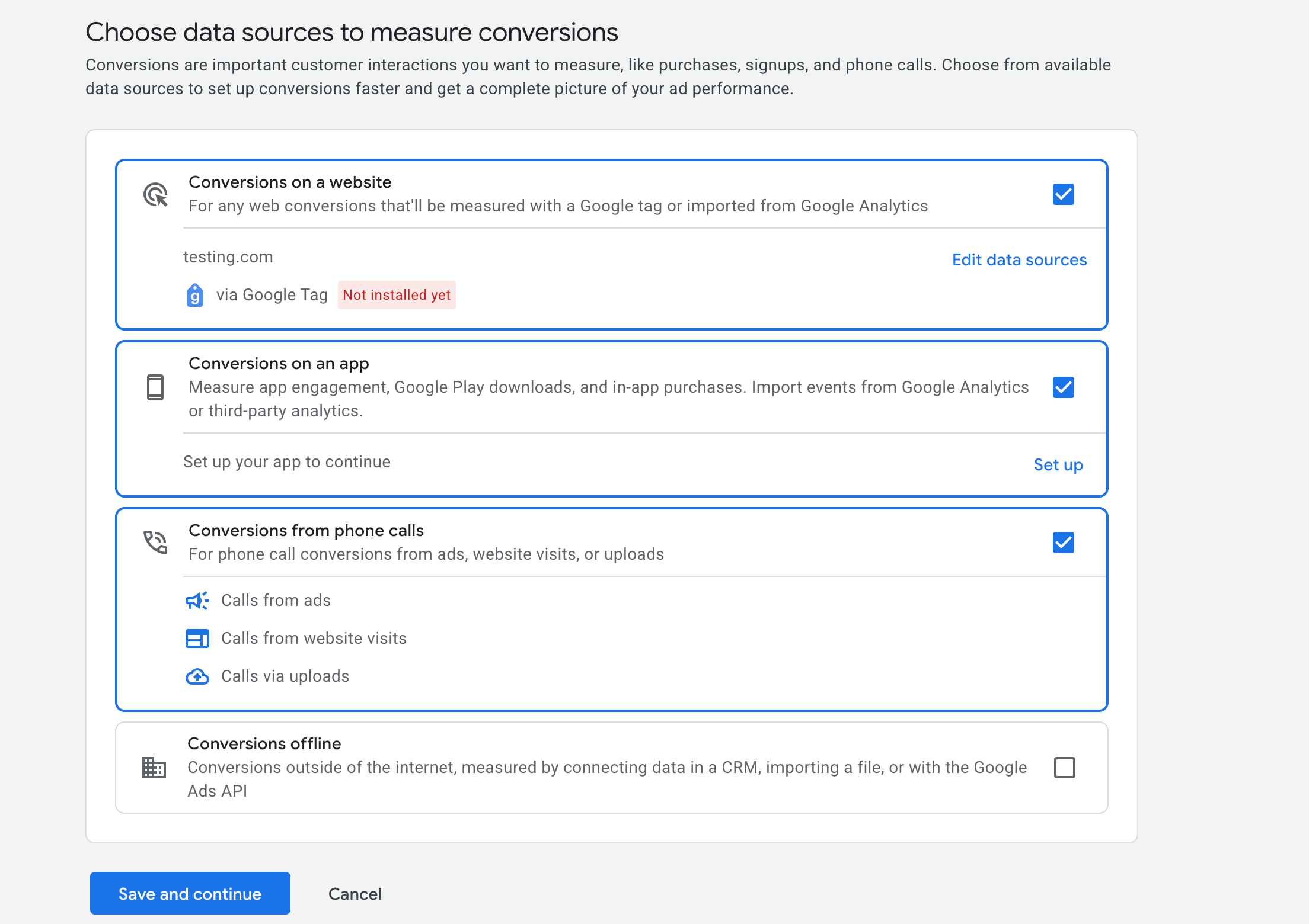 Choose data sources to measure conversions depending on your current Google Ads UI prompt. Click on " Save and Continue".