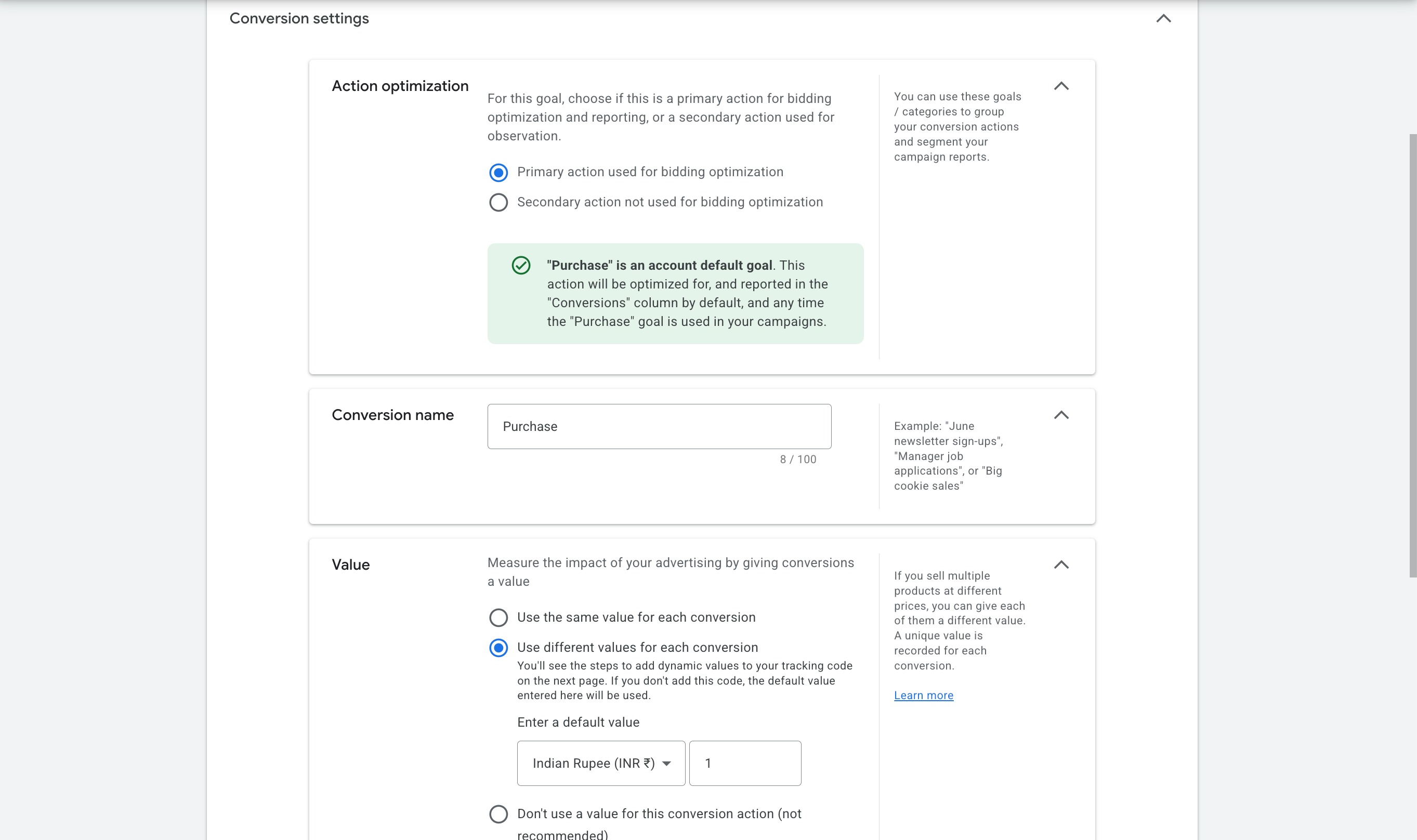Click on Conversion Settings and configure Conversion name, Value, and Count.