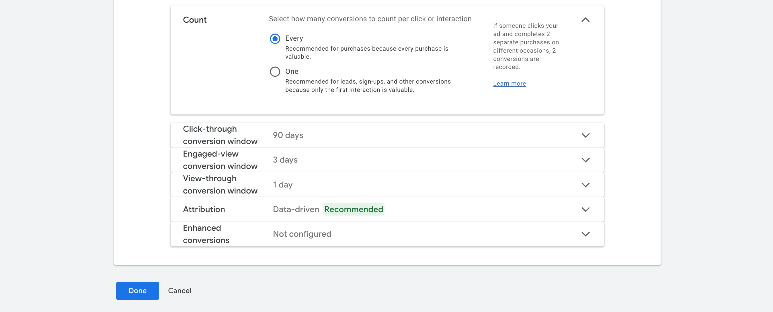 Control Over Counting: Decide whether to count Every or One conversion per ad interaction.