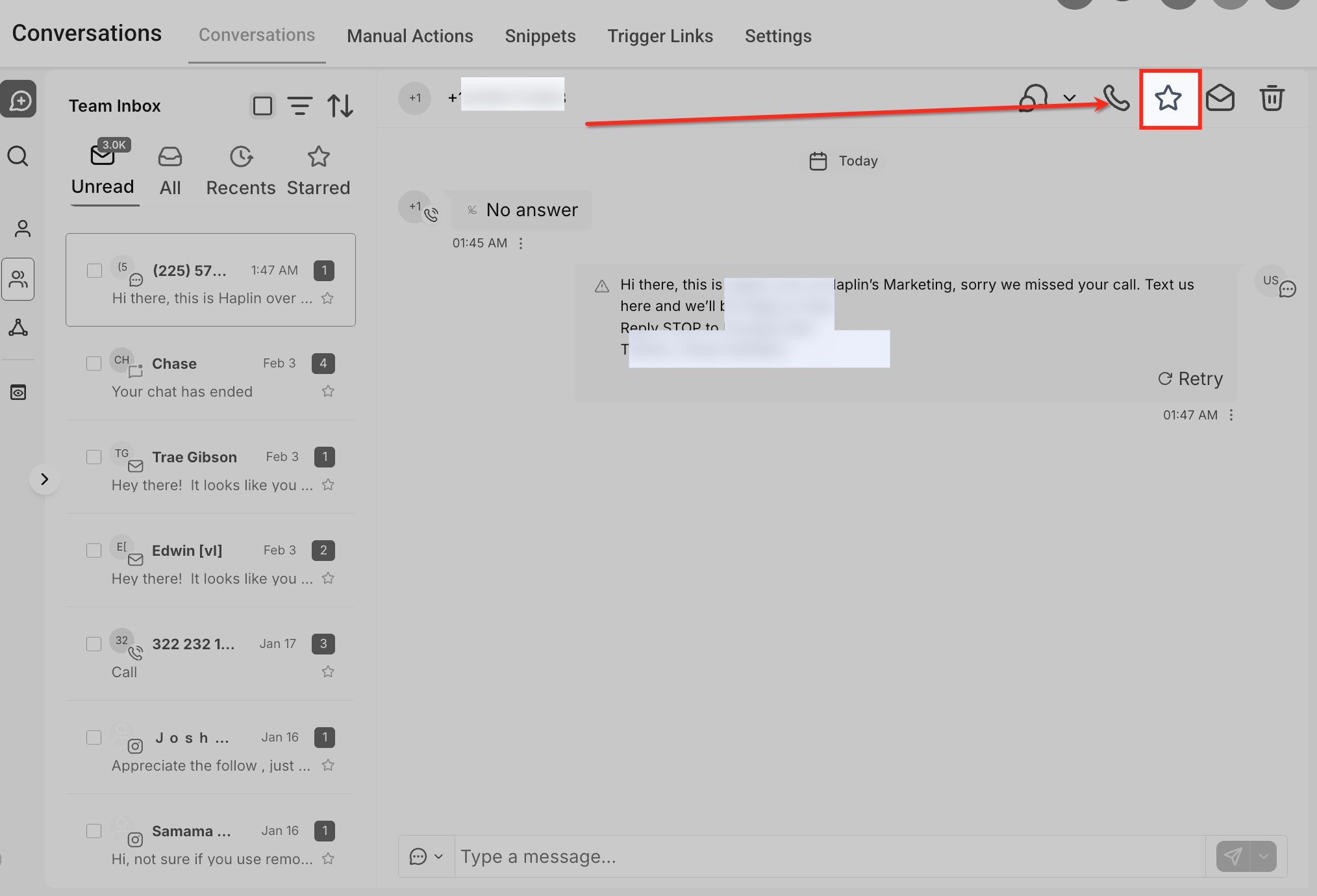 - Clicking the star marks the conversation as starred.