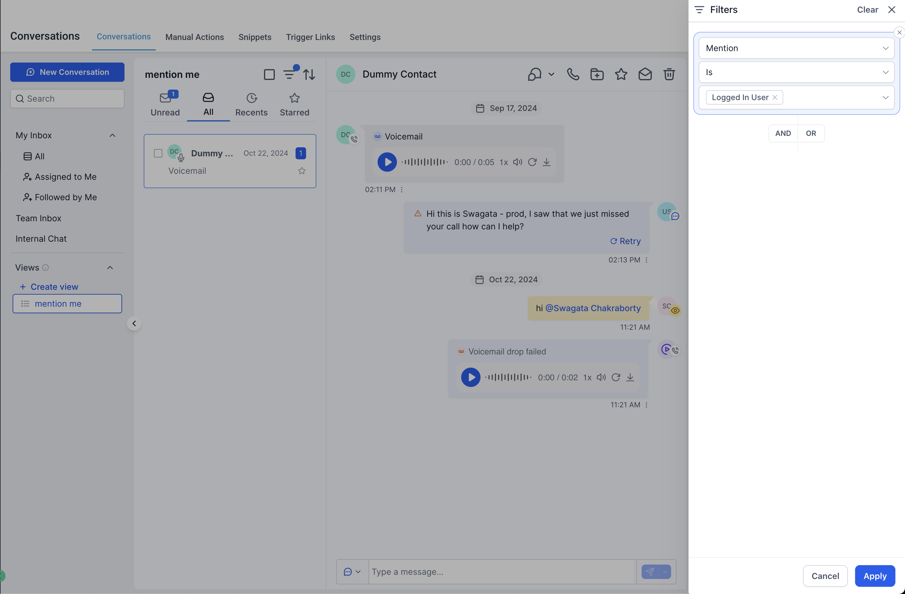 Filters conversations where a user has been mentioned using an @mention. This is helpful for locating conversations that require attention or were explicitly flagged for a specific team member.