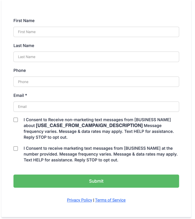 - Include Privacy Policy and Terms of Service: The website where opt-in occurs must contain a privacy policy and terms of service.