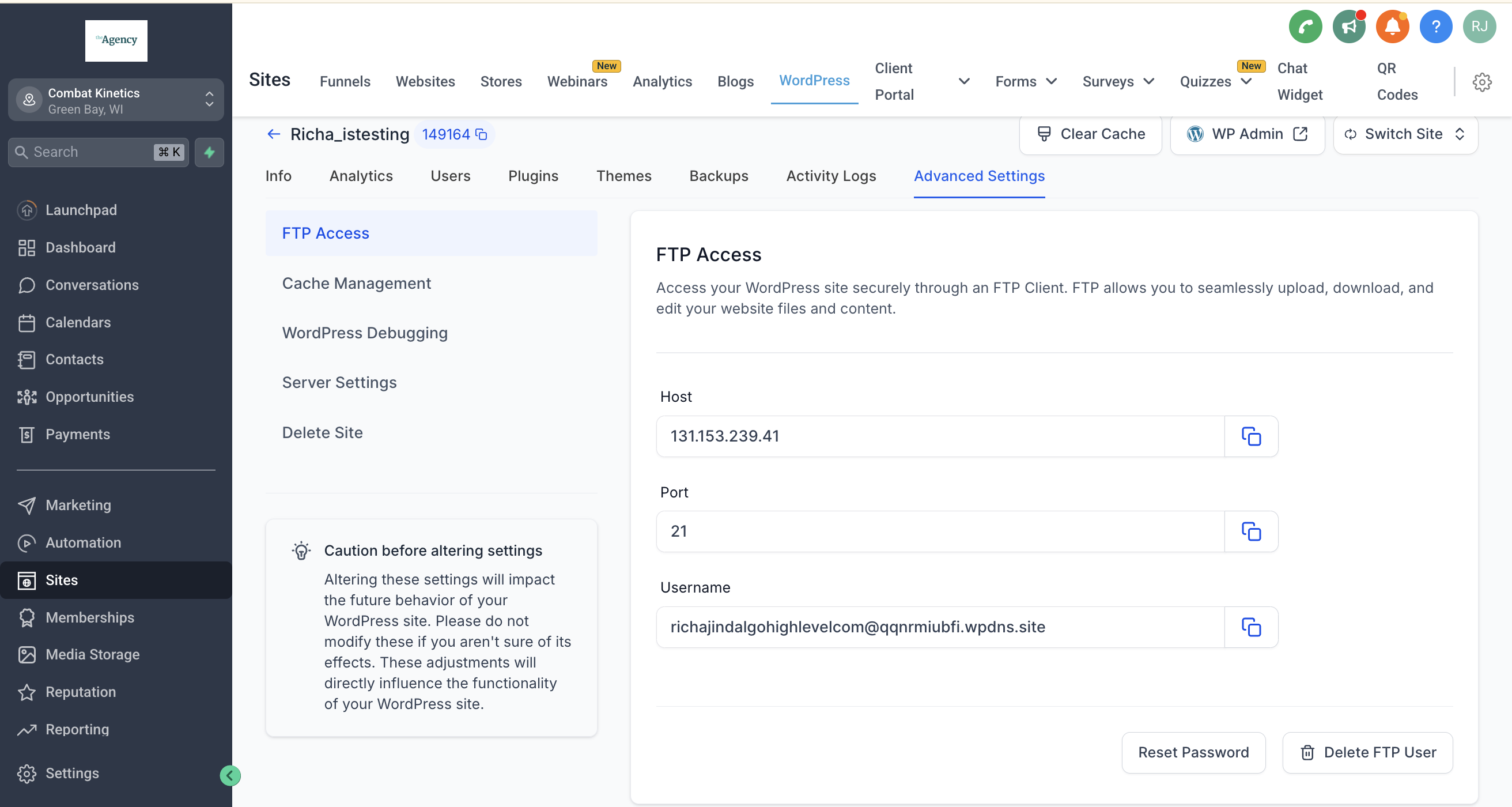 3. The Host URL, Port number, Username, and Password can be used to log in to a client program and access the WordPress files. Make sure to keep these credentials safe. The UserName and Password are unique for each user and you can even reset these credentials.