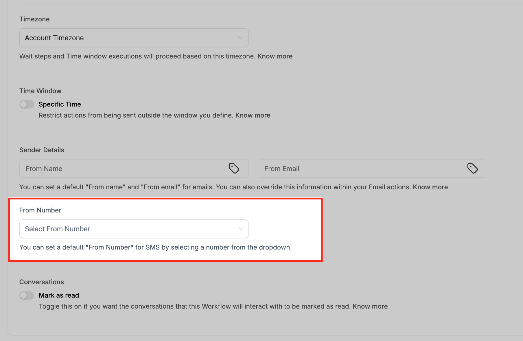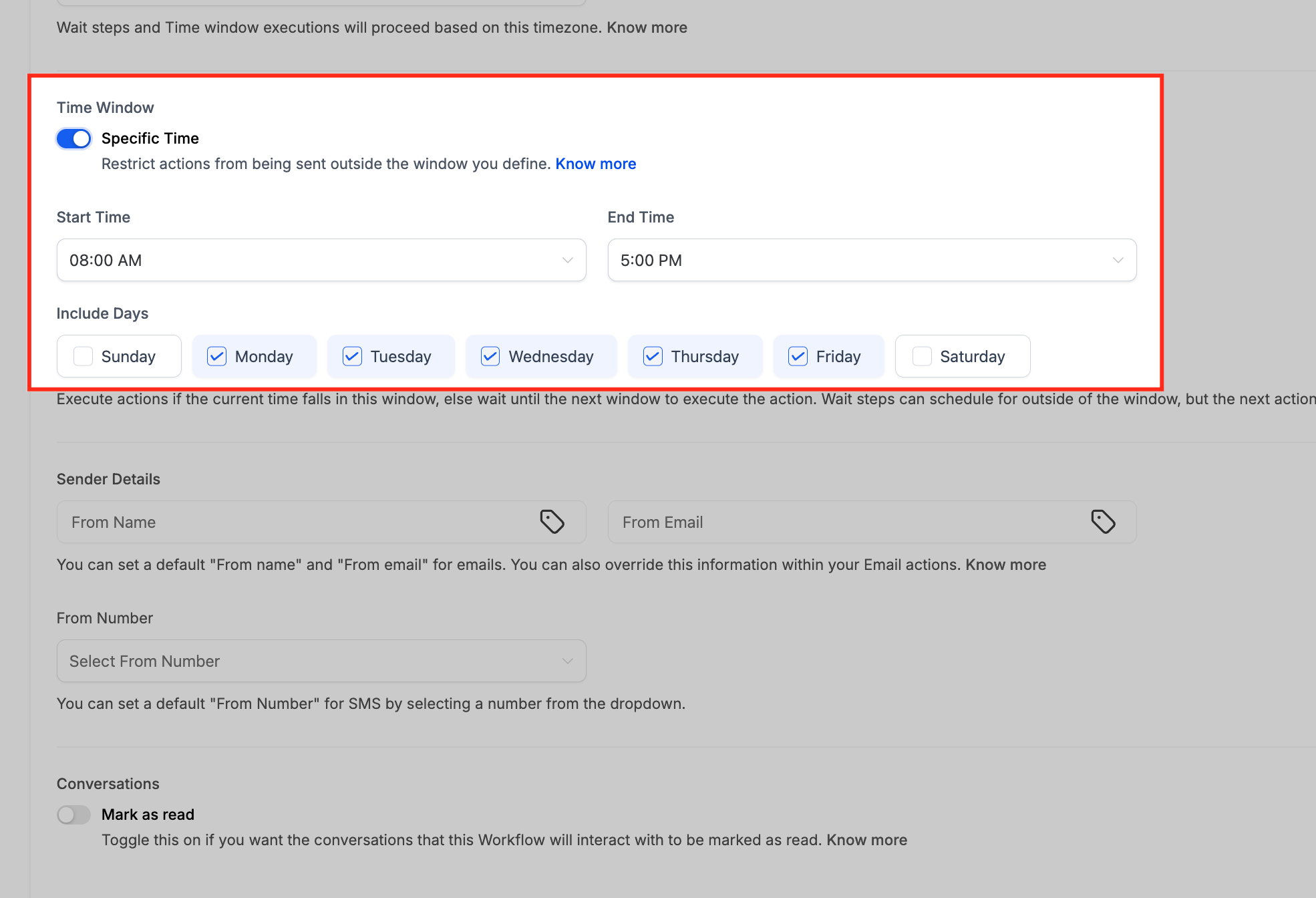 These settings manage the timing, sender identity, and conversational properties of messages sent from the workflow. Use them to ensure your communications are timely, professional, and properly managed.